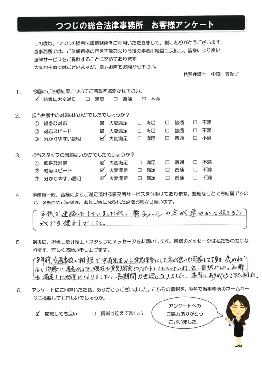 8年前交通事故のs法談で、中森先生から労災保険にした方が良いと回答していただき、気兼ねなく治療に専念ができ、現在も労災保険でサポートしてもらっています。