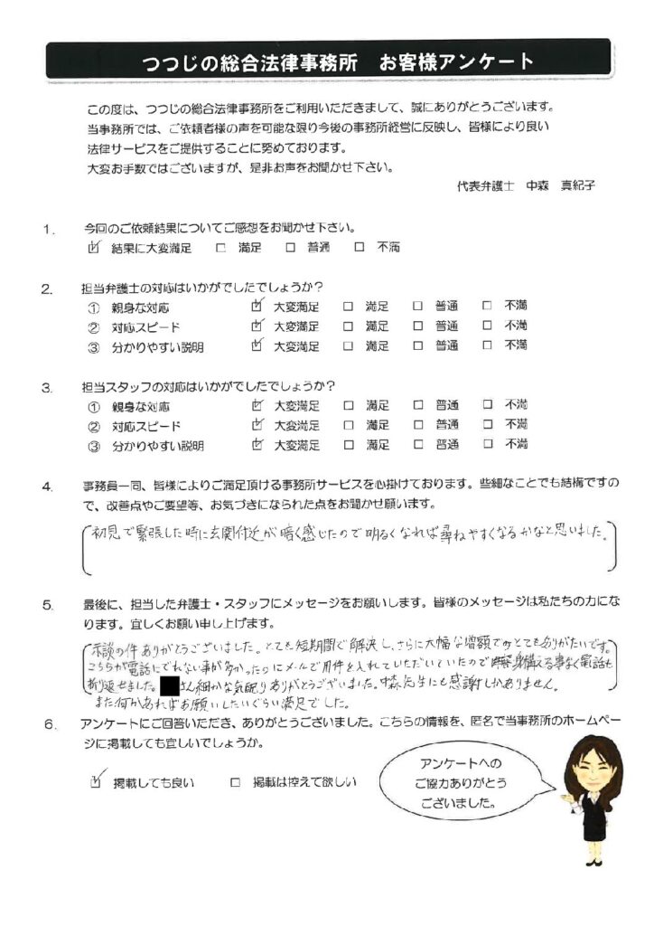 示談の件ありがとうございます。とても短期間で解決し、さらに大幅な増額でとてもありがたいです。